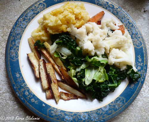 A traditional start to the challenge with parsnip chips (pan fried) and parsnip, swede and potato mash. Also in this veggie extravaganza are carrot chips, cauliflower and various greens from the garden.